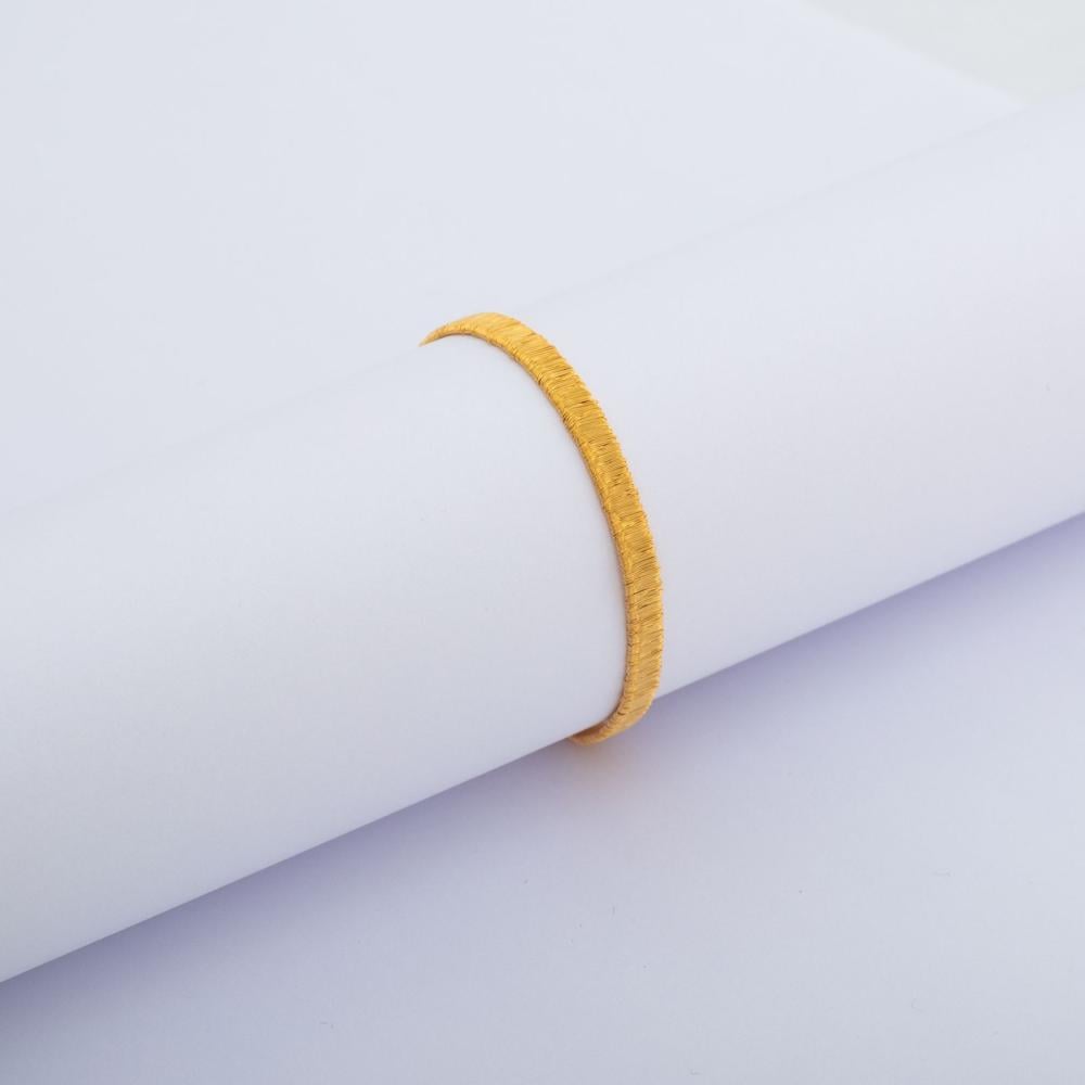 هذه الأساورة الذهبية عيار 21 تتميز بتصميمها البسيط والأنيق. مصنوعة من الذهب الأصفر النقي، مما يمنحها مظهراً سلساً ومتناسقاً. بفضل خطوطها النظيفة والبسيطة، تعد هذه الأساورة مثالية للارتداء اليومي أو المناسبات الخاصة، حيث تعكس الضوء بشكل جميل وتضيف لمسة من التألق لمرتديها.