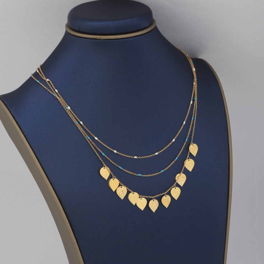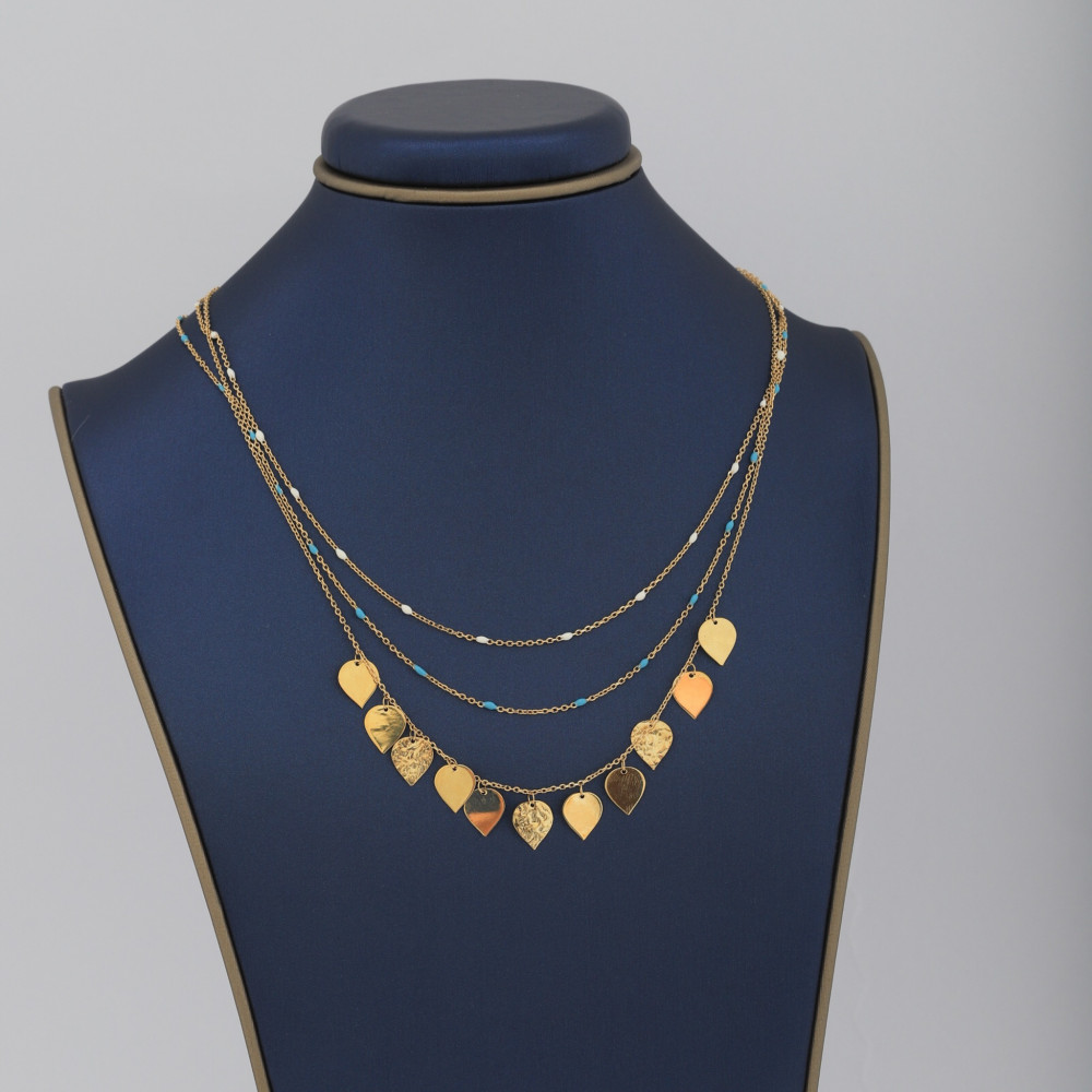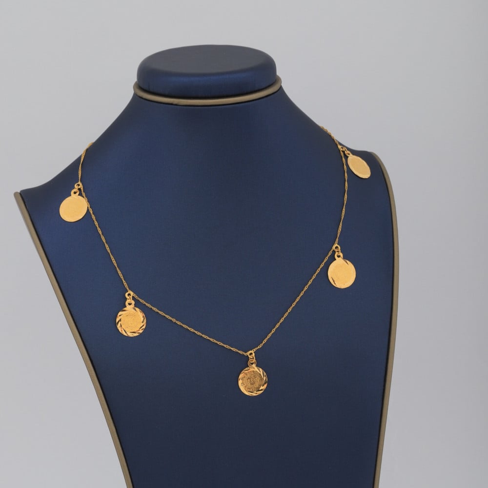 عقد ذهبي عيار 18 بسيط وأنيق، مصمم بأنامل مبدعة تجمع بين روعة الذهب التي تضفي سحراً خاصاً على التصميم. يتزين هذا العقد زريكون متلألئة تضفي لمسة من الأناقة والفخامة، مما يجعله قطعة مميزة تبرز جمال وأناقة صاحبتها في أي مناسبة.