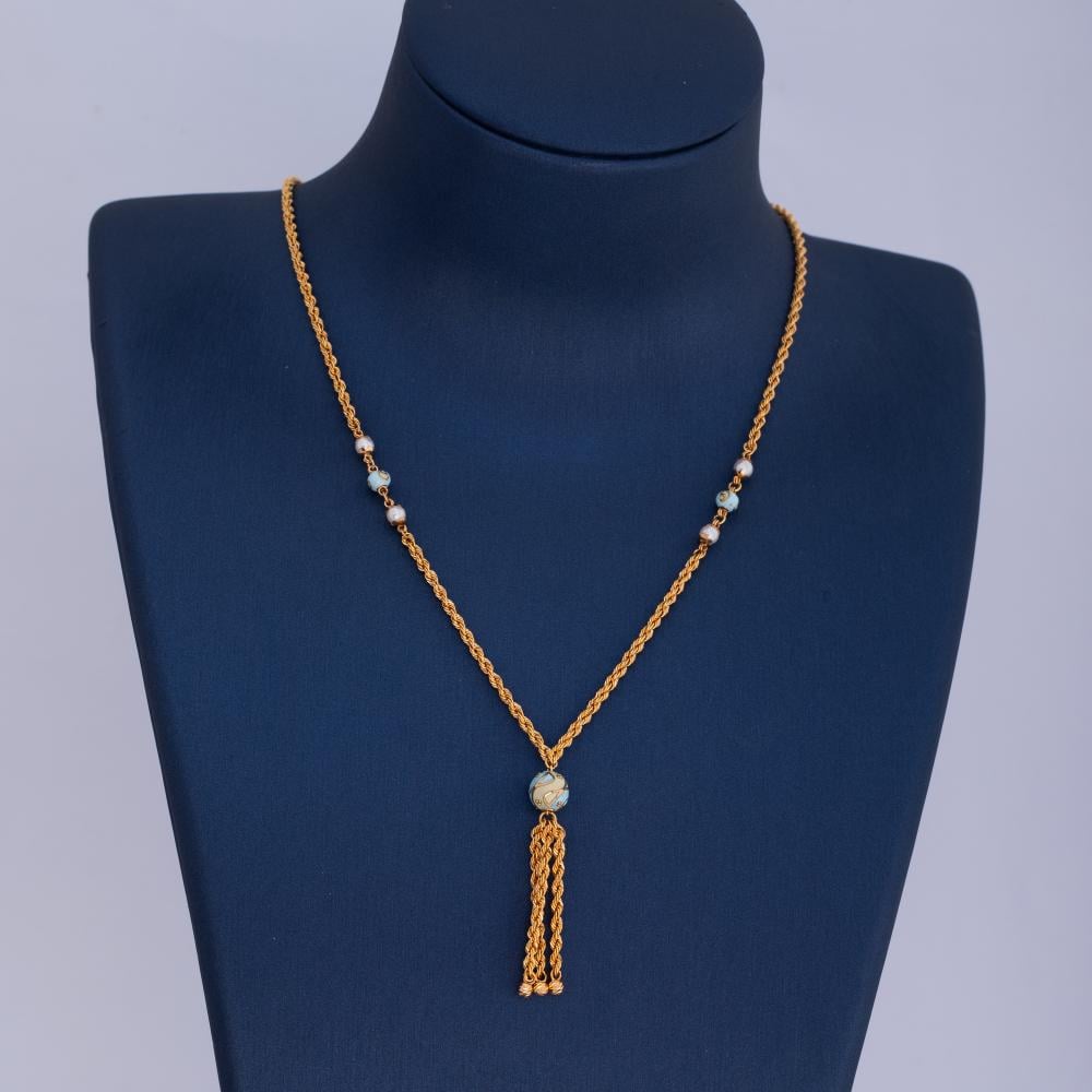 تفاصيل المنتج:وزن العقد: 4.39 جرامنقاوة الذهب: 21 قيراطلون العقد: اصفرنوع الفصوص: بالاوان المينا فيروزي-ابيض لون الحجر: لولو زراعيمميزات المنتج:مناسب للفتيات و النساءتصميم مميز و انيقالقفل امن و عملي