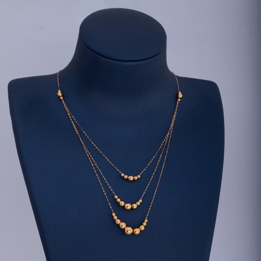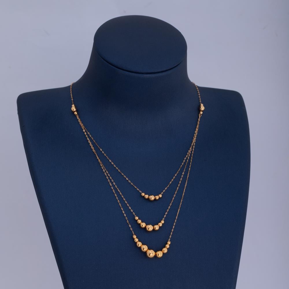 تمتعي بلمسة من الفخامة مع عقد ذهبية عيار 21 من مجوهرات عبدالمحسن النمر، مصممة بالكامل من كرات النانو لتضفي لمسة من البريق الراقي والأناقة على إطلالتك.